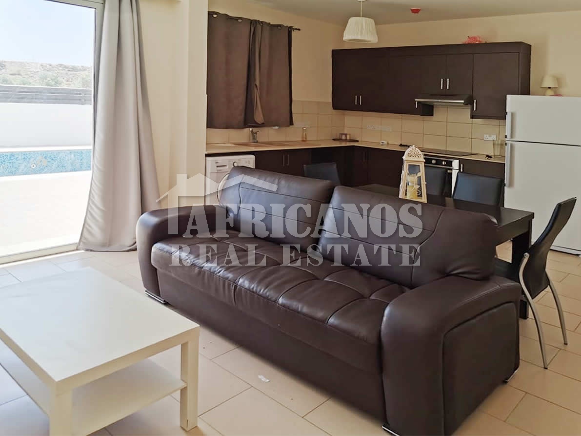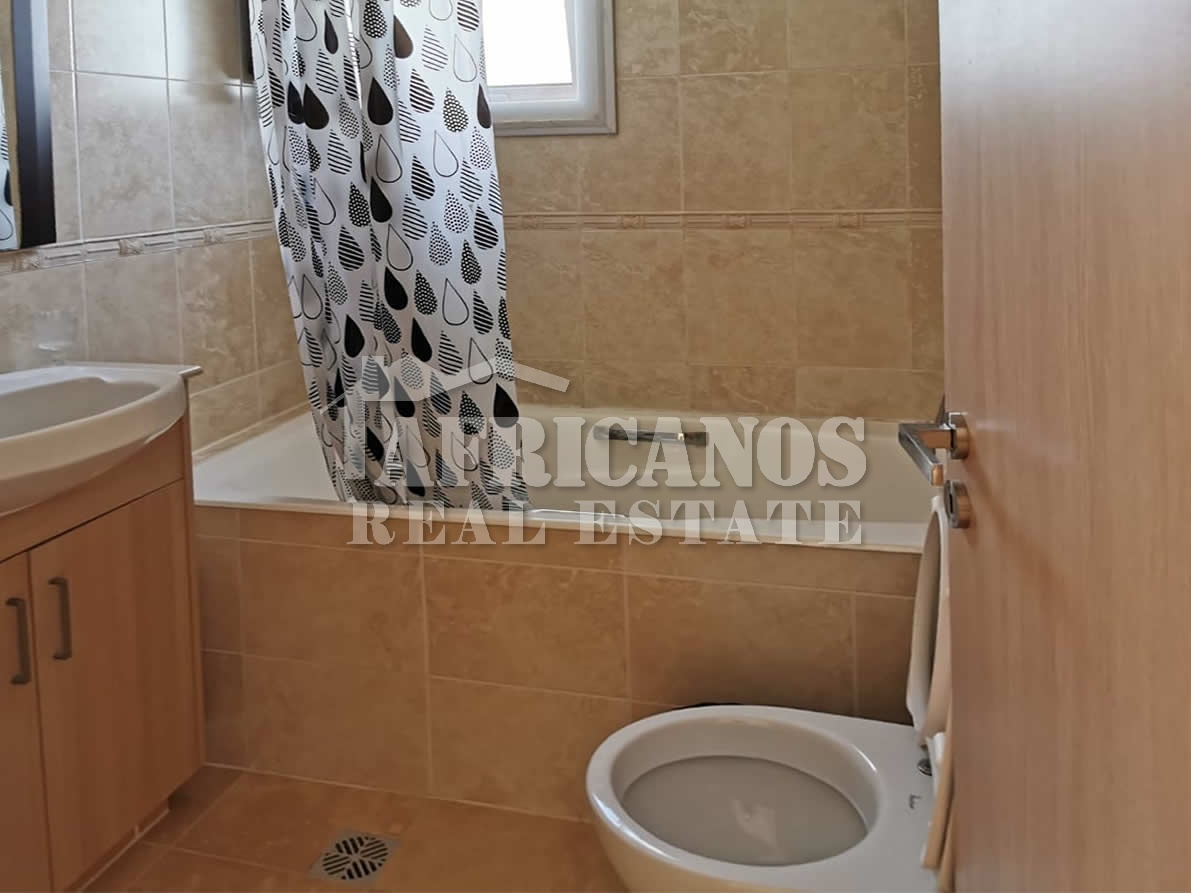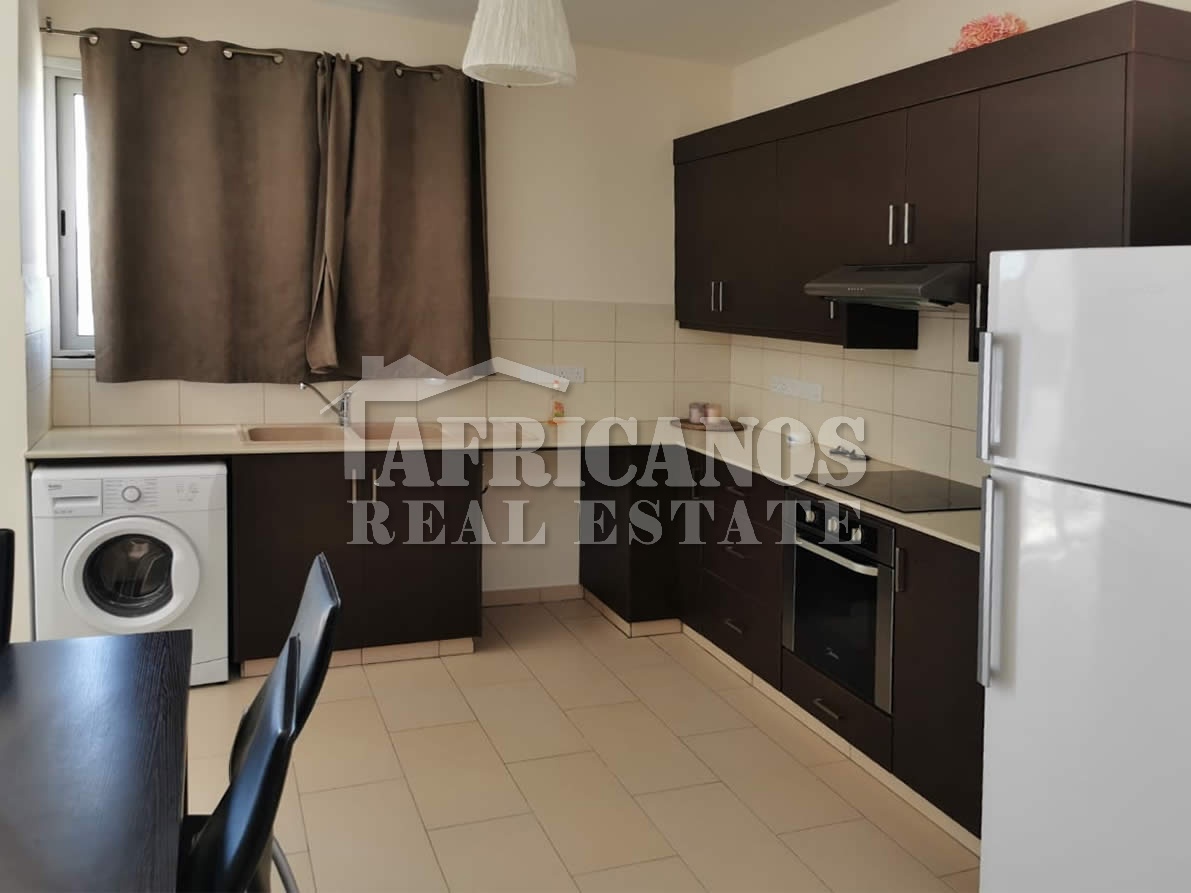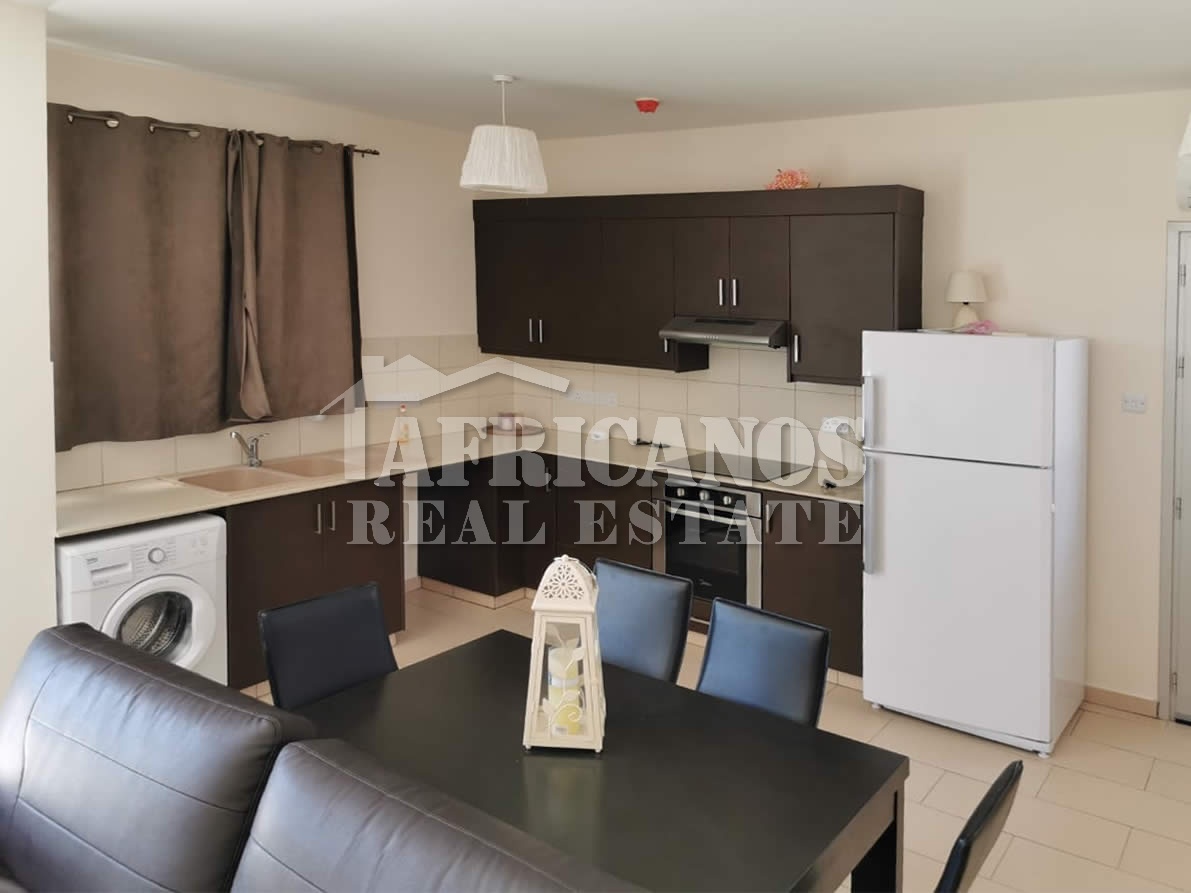 #House for rent in Larnaca. The property consists of 2 bedrooms, open plan kitchen, living room, 1 bath, 2wc, common pool, kitchen appliances, A/C, open and covered parking.