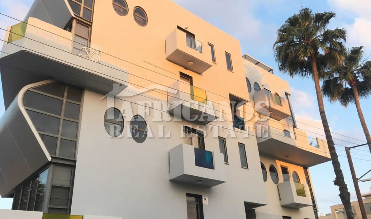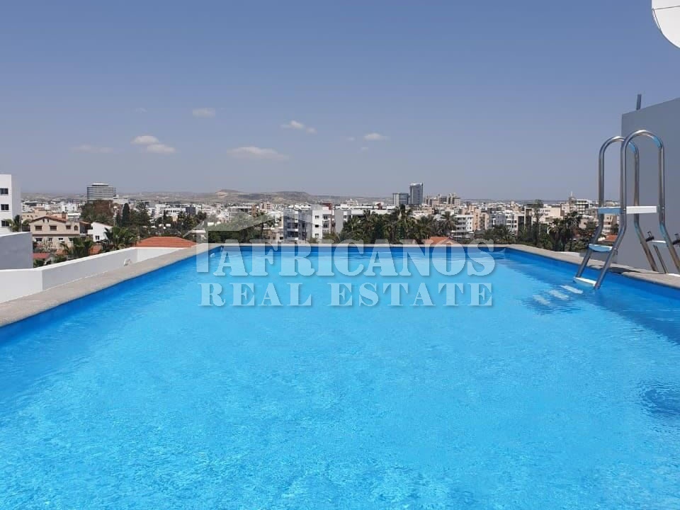 #Apartment for rent in Larnaca. The property consists of 3 bedrooms, open plan kitchen, living room, 1 bath, 1 shower en-suite, 3wc, common pool on the roof, covered parking, A/C, CH, double glazing.