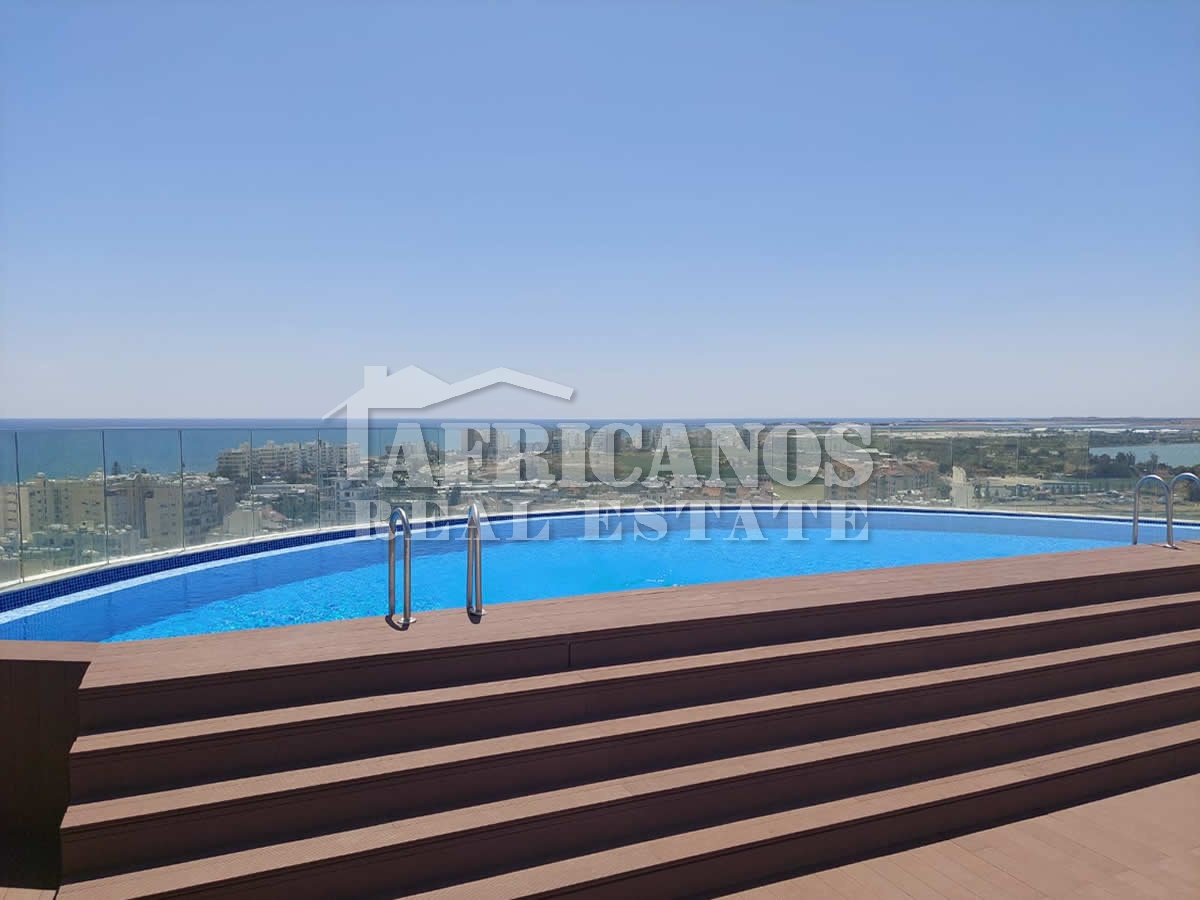 #Apartment for rent in Larnaca. The property consists of 2 bedrooms, stylish open plan kitchen, living room, 2 showers (1 shower en-suite), 2wc, covered parking, large verandas, A/C, common roof top with infinity pool which offers panoramic city and sea views. Price includes common charges.