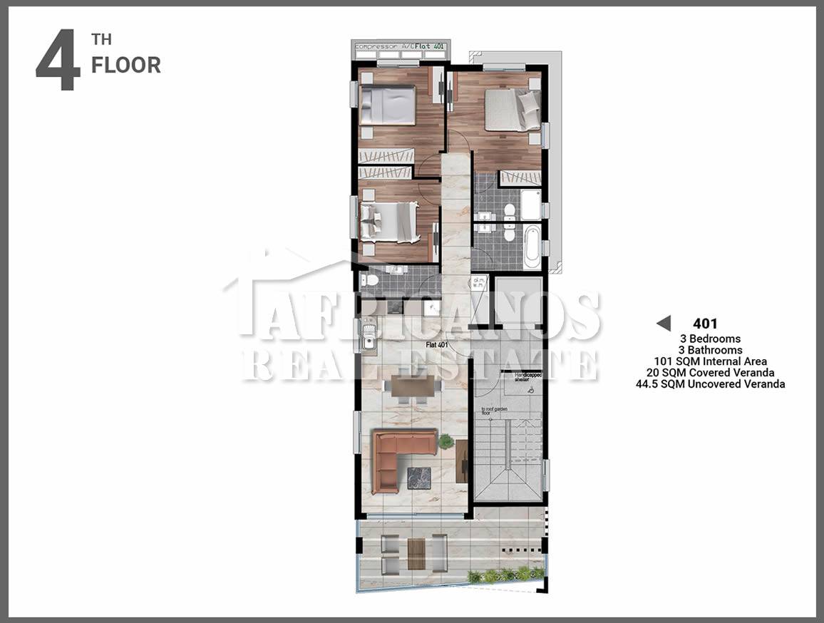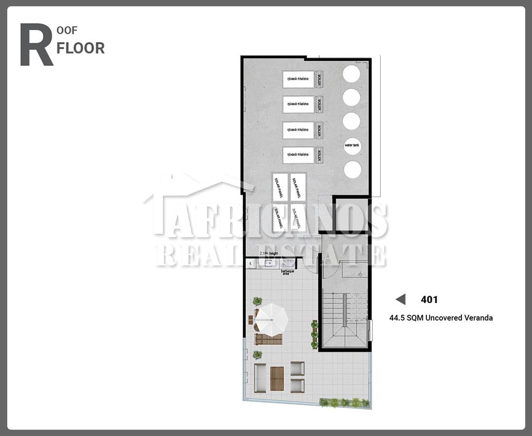 #Apartment for sale in Larnaca. The property consists of 3 bedrooms, open plan kitchen, living room, 1 bath, 1 shower en-suite, 3wc, 20sq.m. covered verandas, 44.5sq.m. roof garden and uncovered verandas, covered parking, storage.