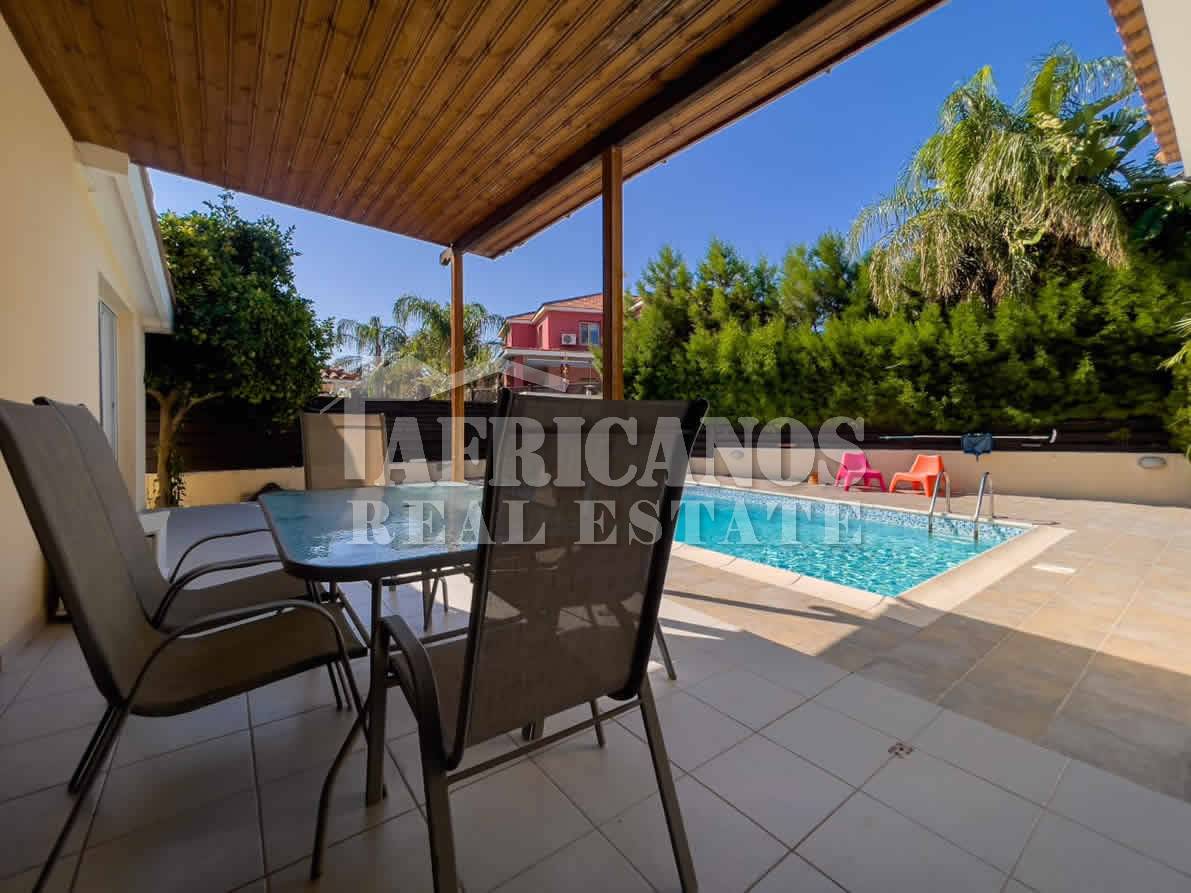 #House for rent in Larnaca, Oroklini area. The property consists of 3 bedrooms (Presently 2 bedrooms and 1 study), open plan kitchen with entrance hall, living room, diner and TV room, 1 bath, 1 shower en-suite, 2wc, private pool, covered veranda, bbq area, separate garage, storage, A/C and fast WI-FI system.