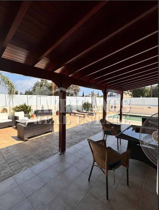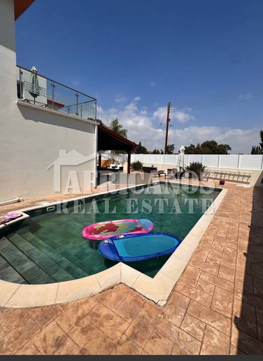 #House for sale in Larnaca, Kiti area. The property consists of 4 bedrooms, open plan kitchen, laundry, living room, wood burner, central heating, A/C, guest wc, master bedroom with walking closets and en-suite shower, outside shower, bath, 3wc, private pool, landscaped gardens, garage with electric door, storage, front and back pergolas, photovoltaic system.