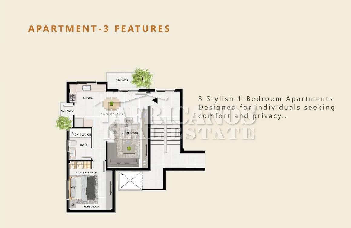 #Apartment for sale in Larnaca. The property consists of 1 bedroom, open plan kitchen, living room, 1 bath, 1wc, 6sq.m. covered verandas, private parking, 4sq.m. storage.