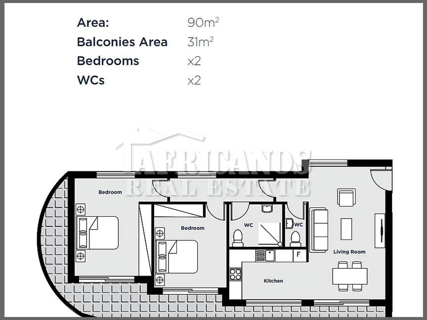#Apartment for sale in Larnaca. The property consists of 2 bedrooms, open plan kitchen, living room, 1 family shower, 1 shower en-suite, 2wc, 31.5sq.m. covered verandas, covered parking, storage.