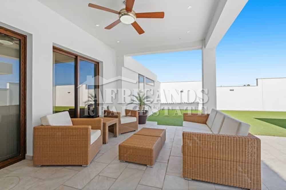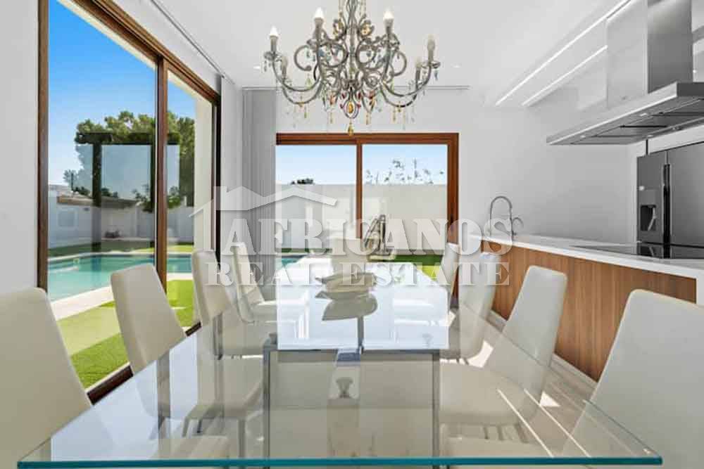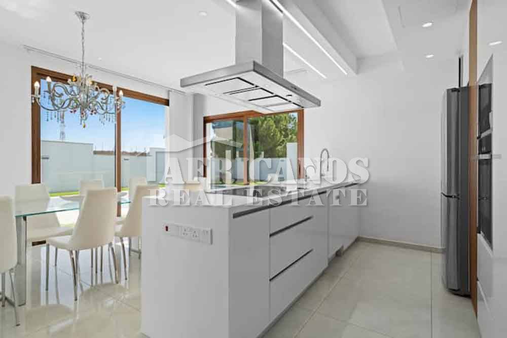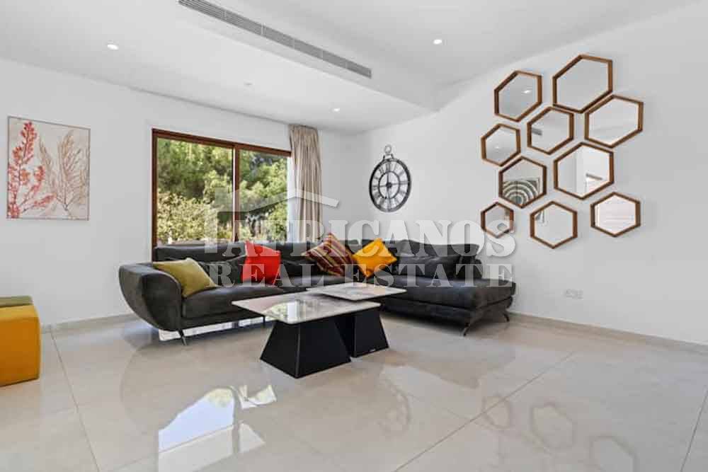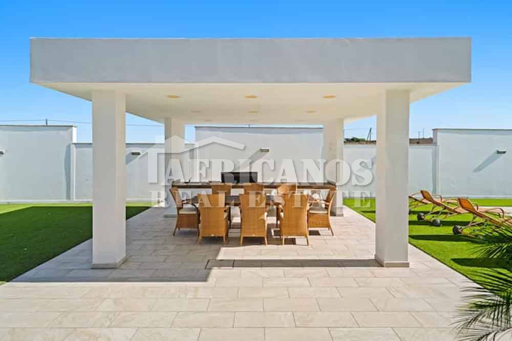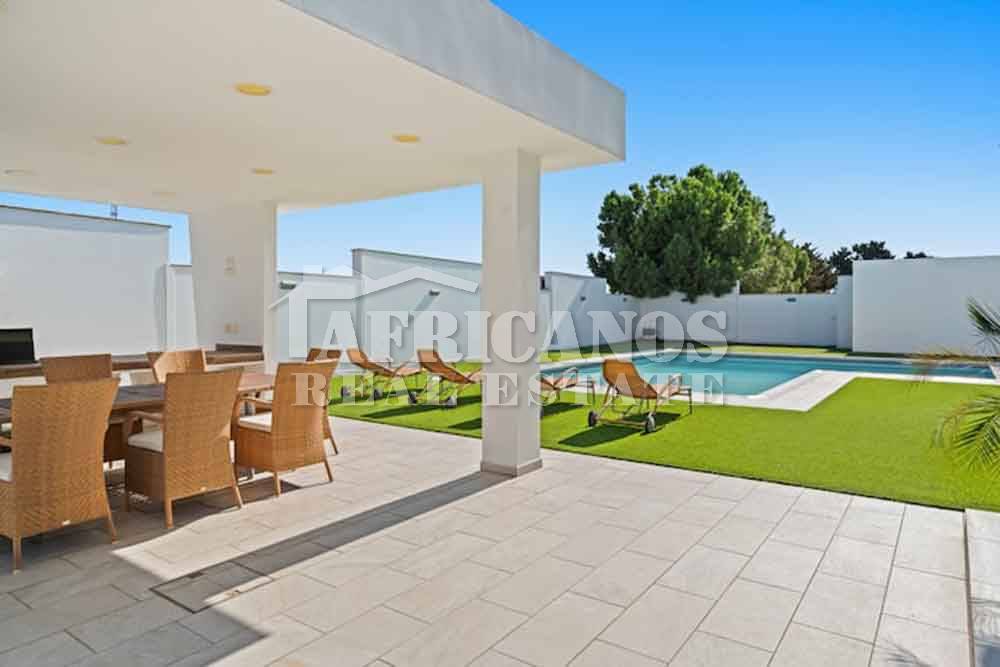 #House for sale in Larnaca, Pervolia area. The property consists of 3 bedrooms, modern kitchen, entrance hall, lounge, diner, guest wc, 1 common shower, 1 shower en-suite, 3wc, large covered verandas with bbq area, private swimming pool, (Pool maintenance included in the price) A/C, photovoltaic system, landscaped garden, fruit trees. Maid`s house with kitchenette, shower and wc, double garage, storage.